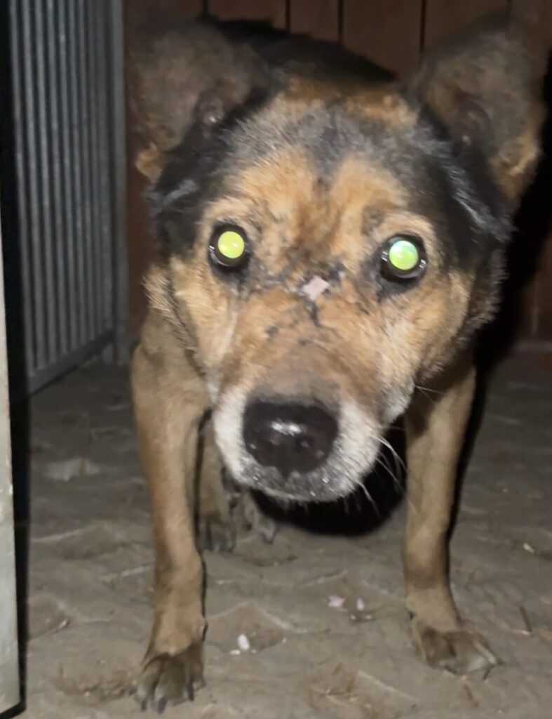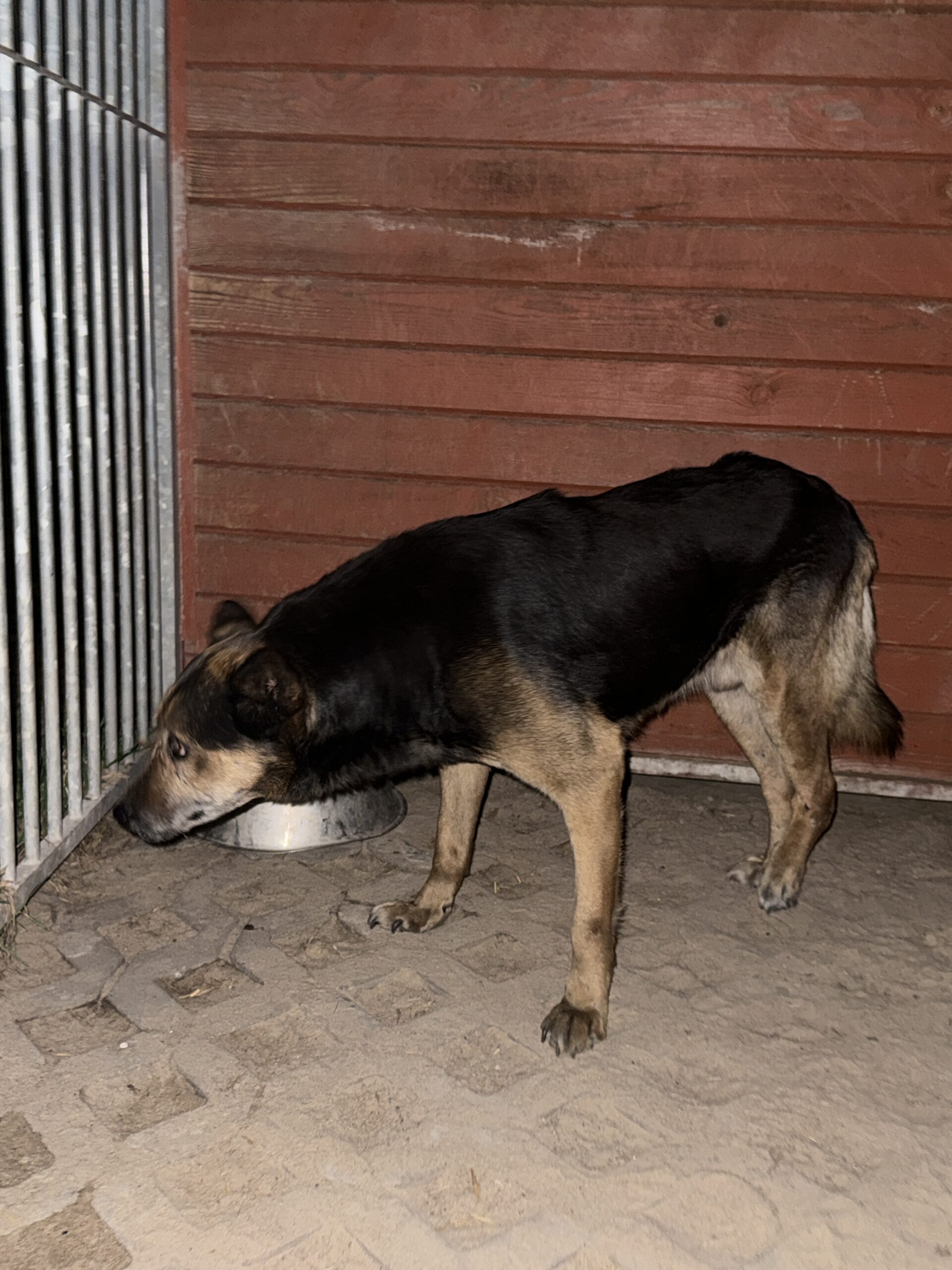 Wygląd: czarny podpalany, blizny na pyszczku, wychudzony, mocna kulawizna tylnej łapy