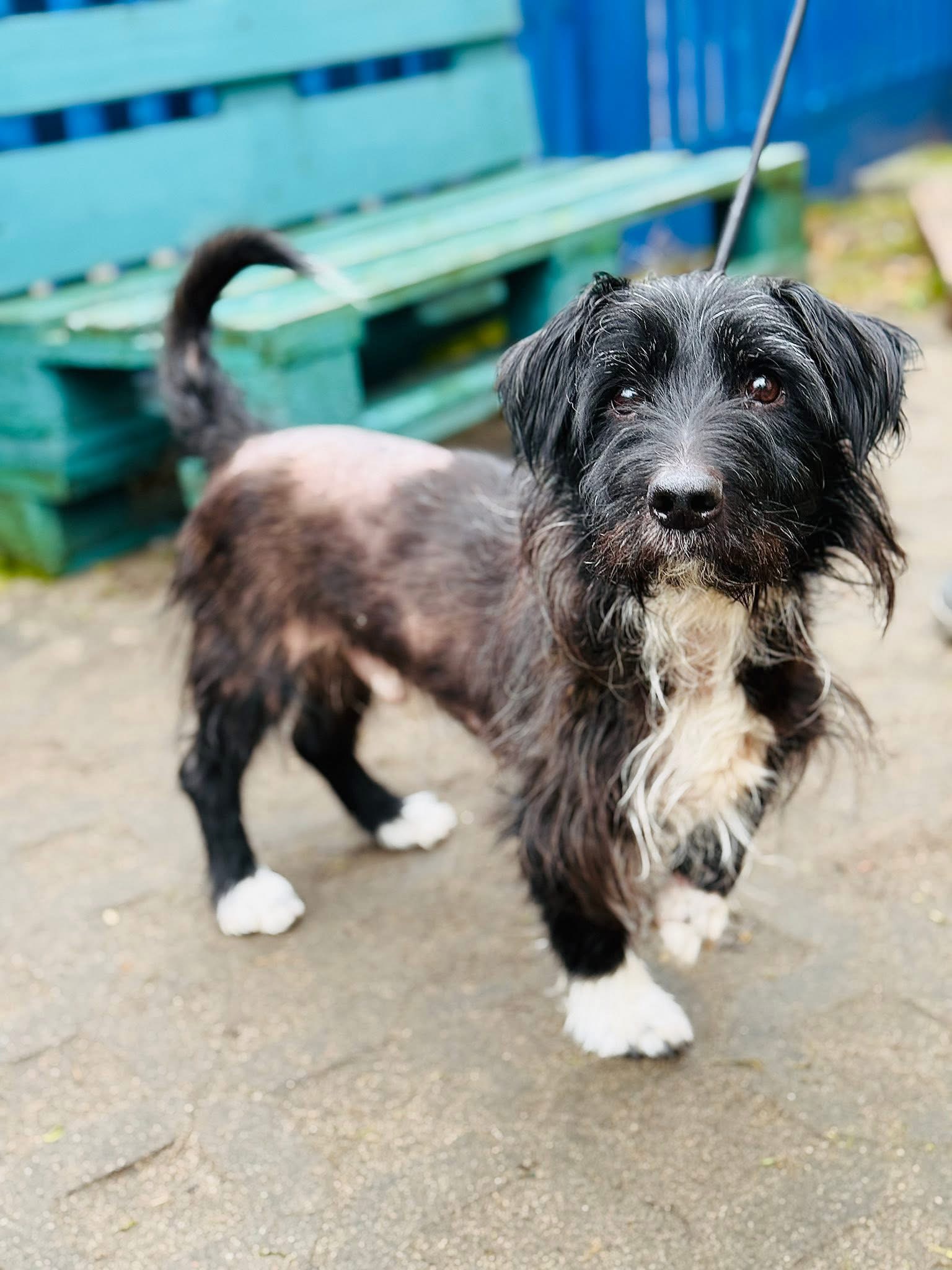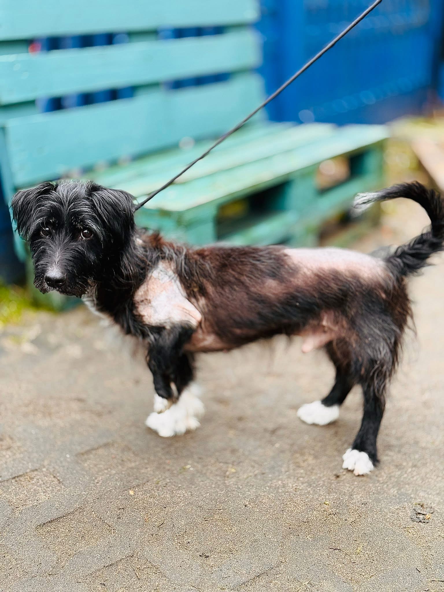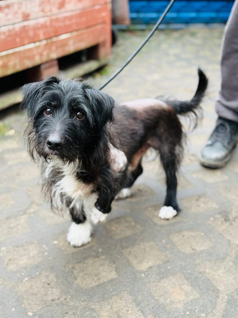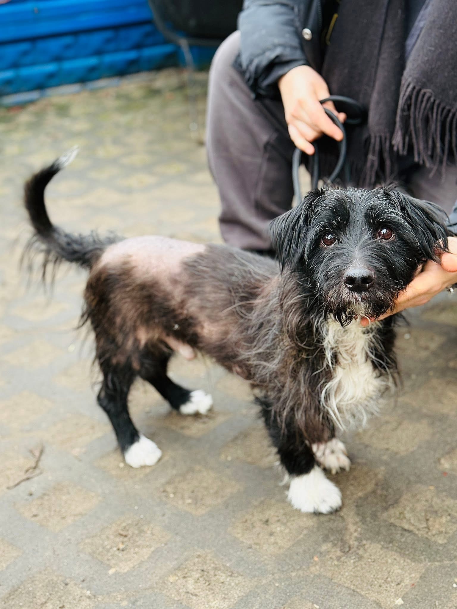 Czarnulek, zgodnie ze swoim imieniem, jest czarną kruszynką. Choć traumatyczne przeżycia sprawiły, że część jego delikatnego ciałka pozbawiona jest sierści, to jest to prawdziwy przystojniak w białych skarpetkach. 🤍🖤