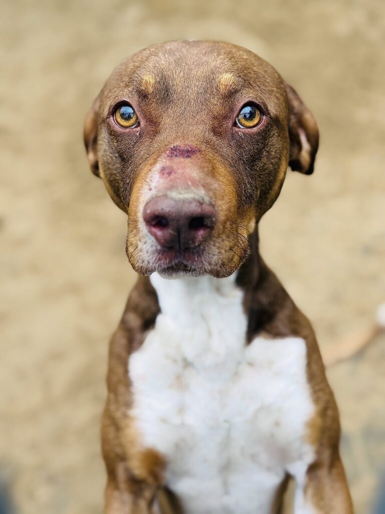 To pies, który wygląda jakby ktoś wymieszał czekoladę z karmelem i dodał odrobinę chmurki na łapach.