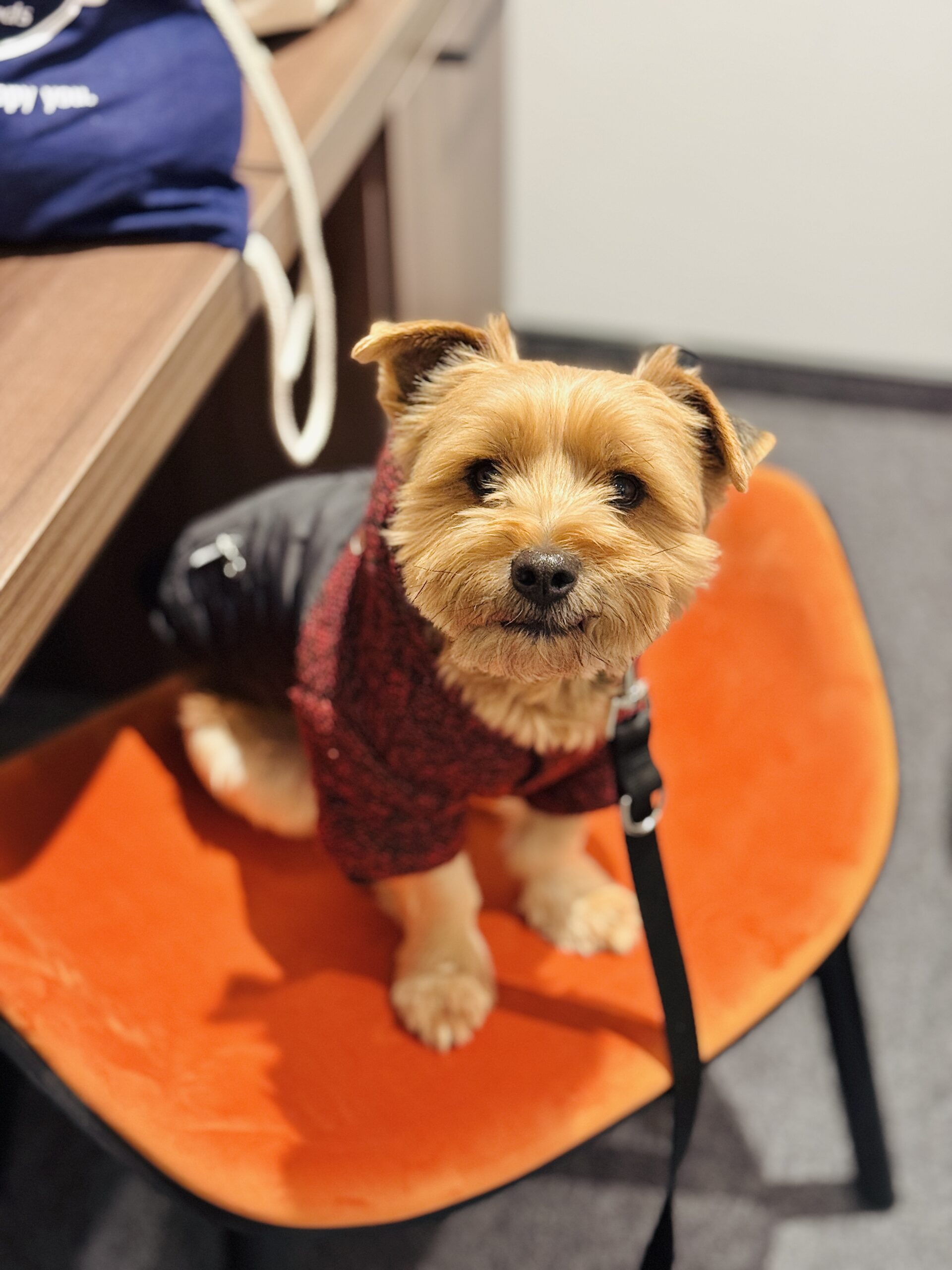 Czasem Toffik mocno reaguje na inny psy – szczeka na smyczy, chce się wyrywać – a w biurze mamy jednego dużego kawalera, którego na razie Toffik nie polubił. 😉