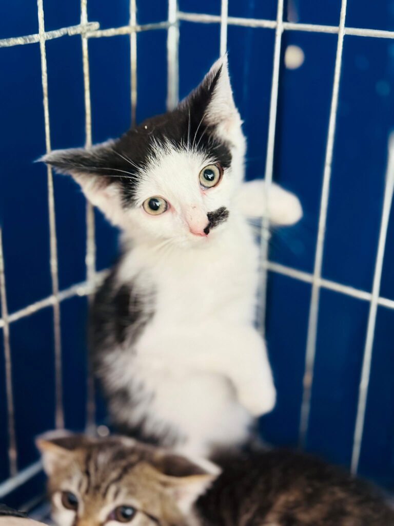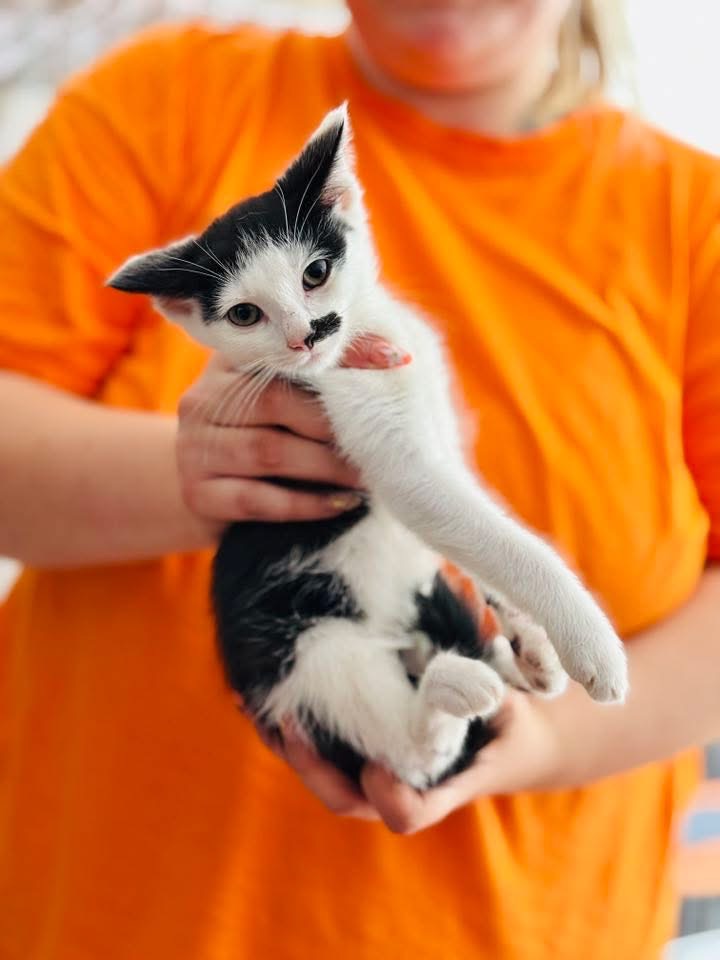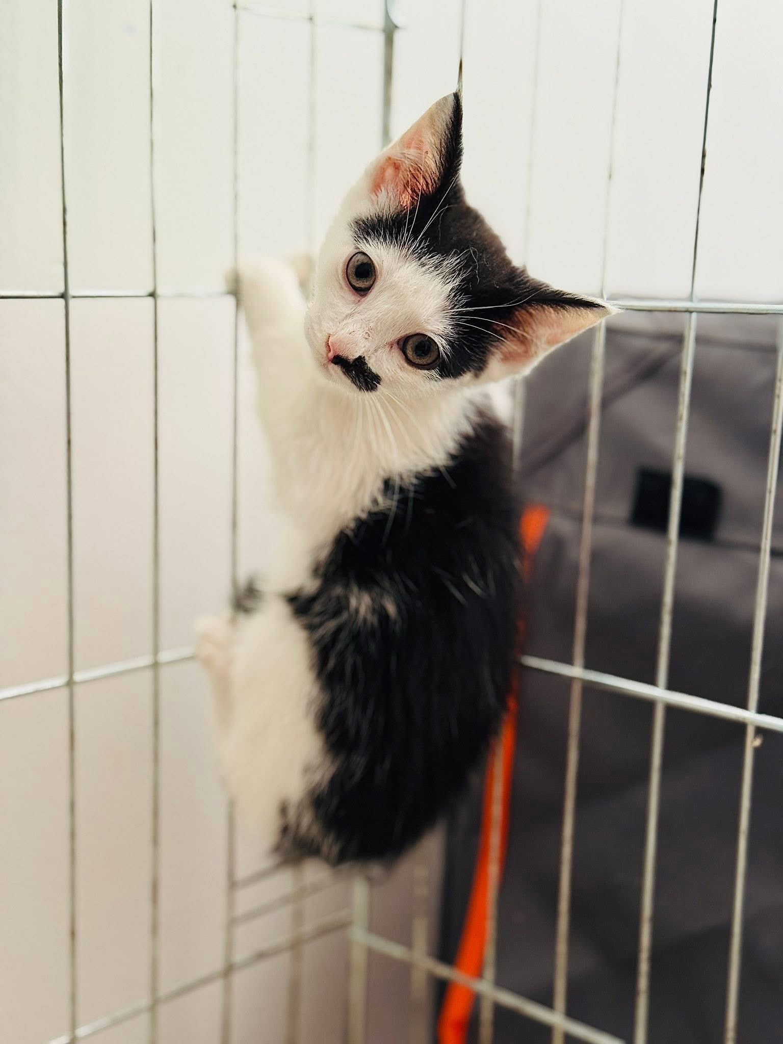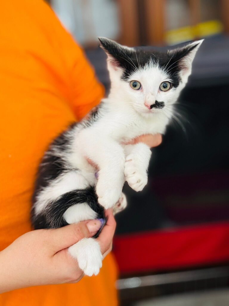 Kotek jest przelękniony – wcześniej raczej nie znał ludzi i dopiero teraz ma z nimi pierwszą styczność.