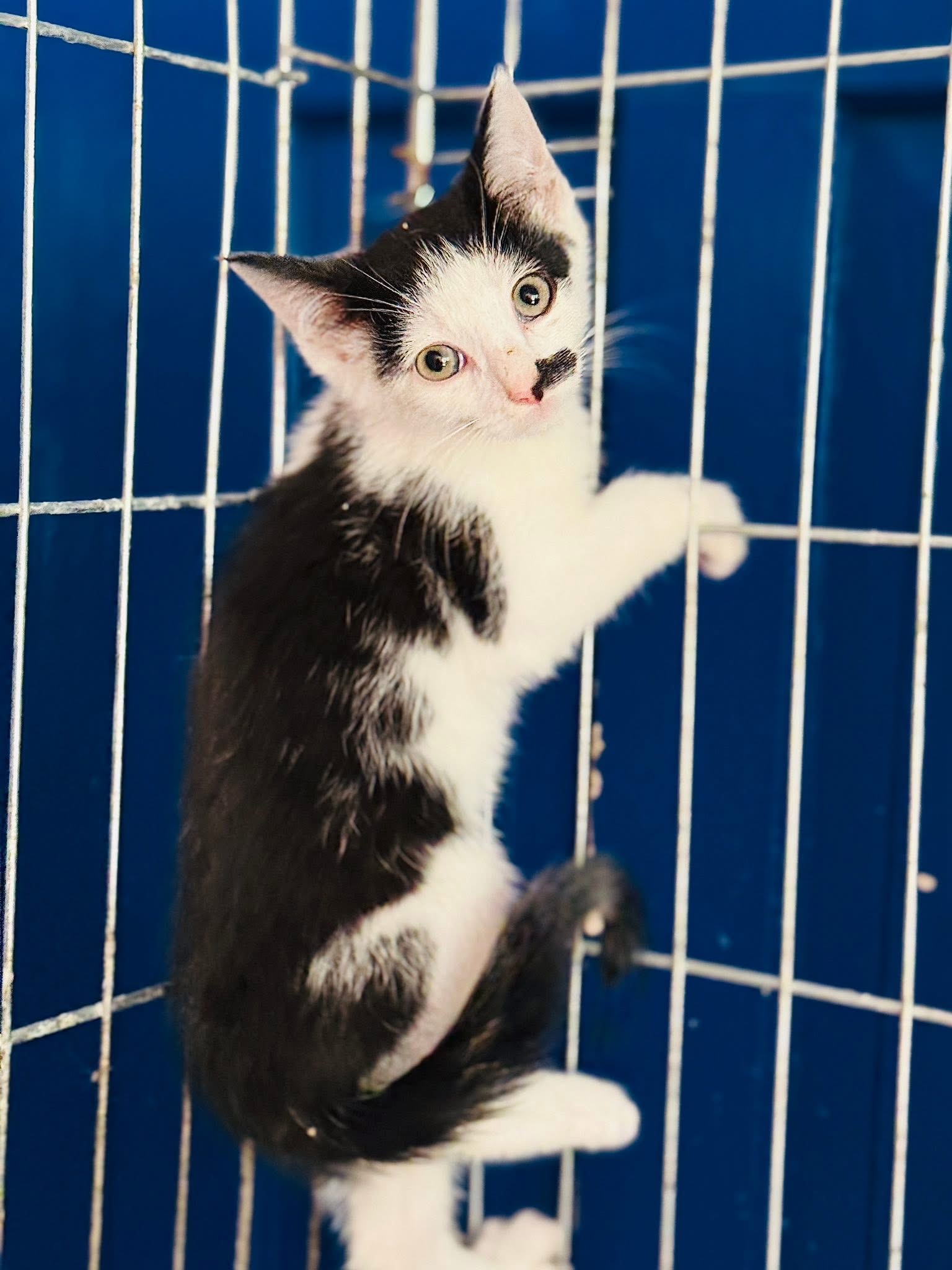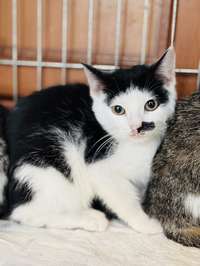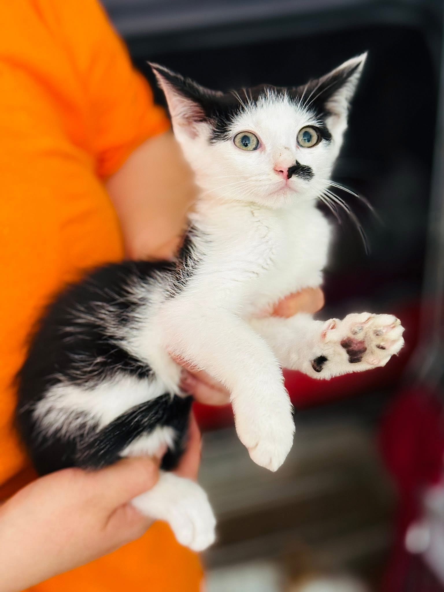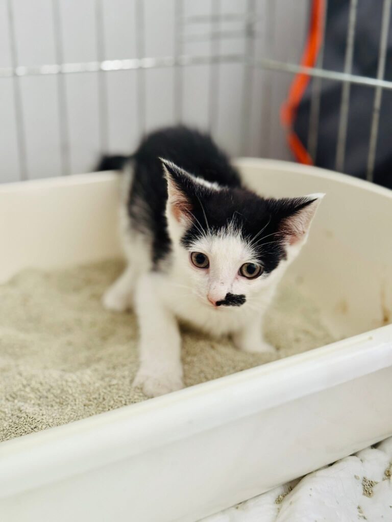 Kotek jest przelękniony – wcześniej raczej nie znał ludzi i dopiero teraz ma z nimi pierwszą styczność.